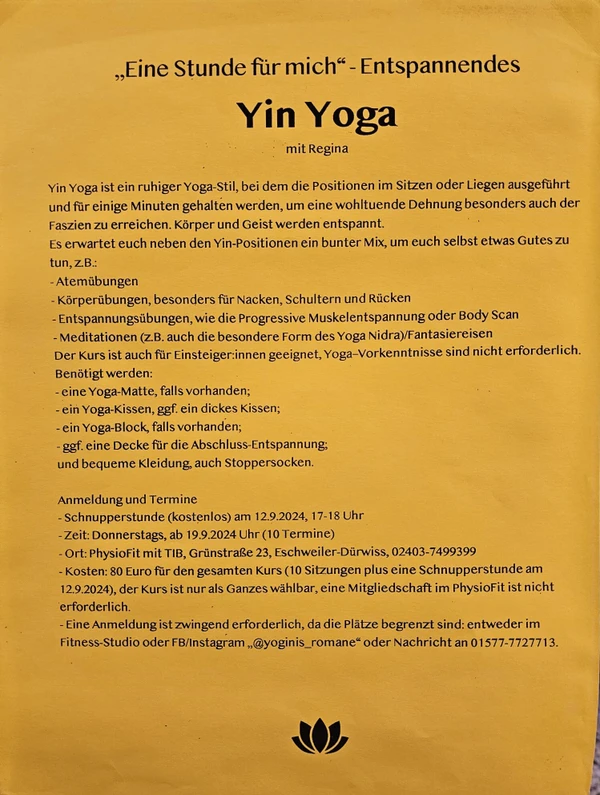 Yin Yoga - Donnerstags von 17:00 - 18:00 Uhr.